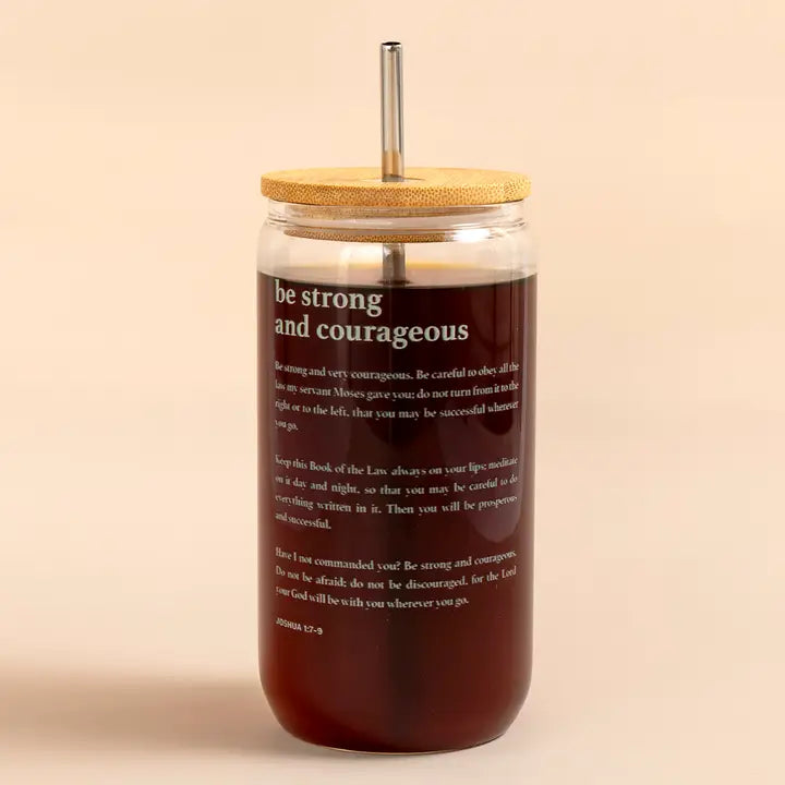 Introducing our Be Strong and Courageous Glass Can, a unique blend of functionality and inspiration. Featuring verses Joshua 1:7-9 from the bible, this glass can is perfect for storing your favorite beverages, whether it's refreshing lemonade on a hot summer day or your morning dose of motivation in the form of energizing smoothies. The glass can allows you to admire the contents within, inspiring you to stay strong and courageous with every sip. Title | Be Strong and Courageous Glass Can Features | Hand-painted design on glass coffee cup with bamboo lid. Straw included. Size | Holds 16 oz; Height: 6.1", Diameter: 3.2" Care Instructions | Hand wash only