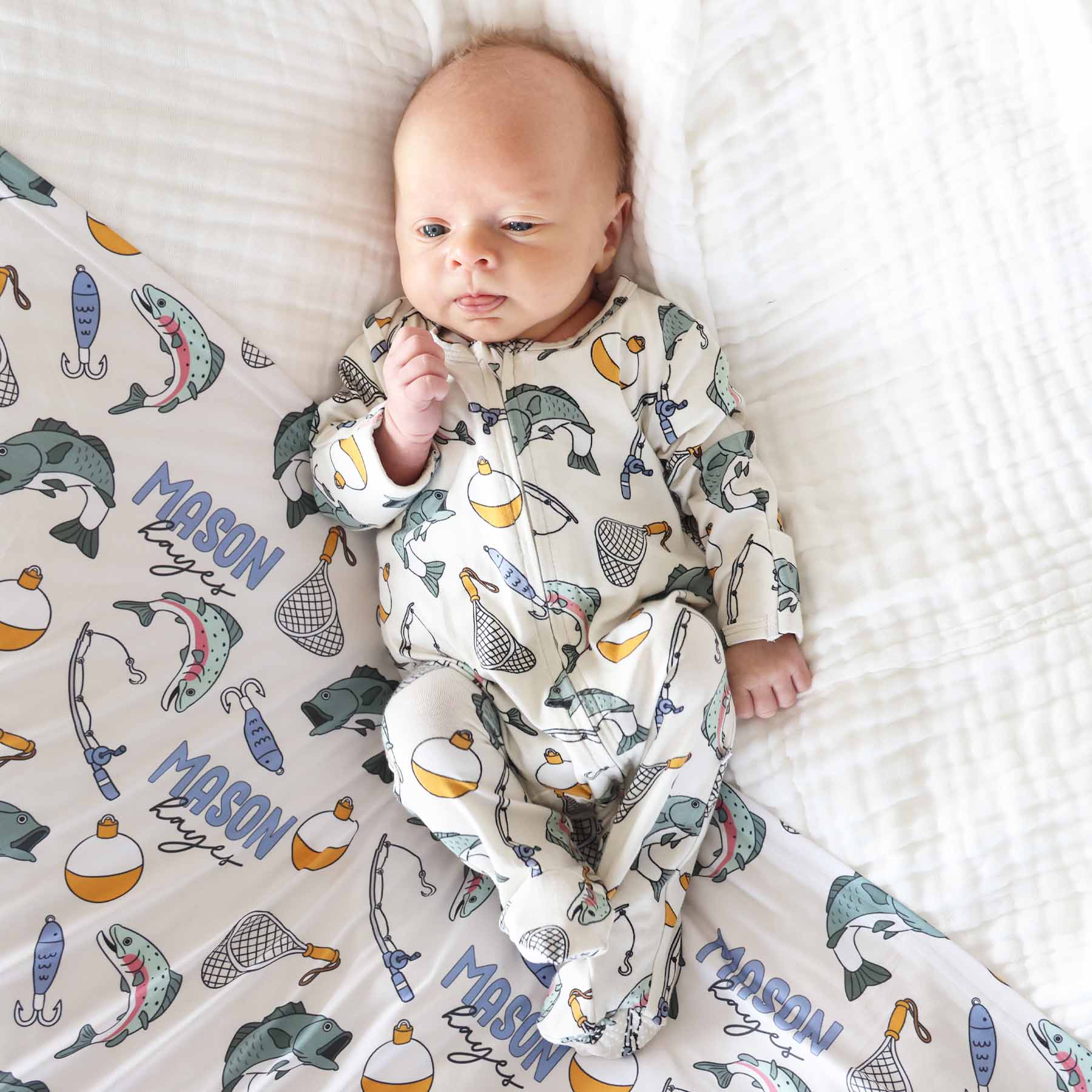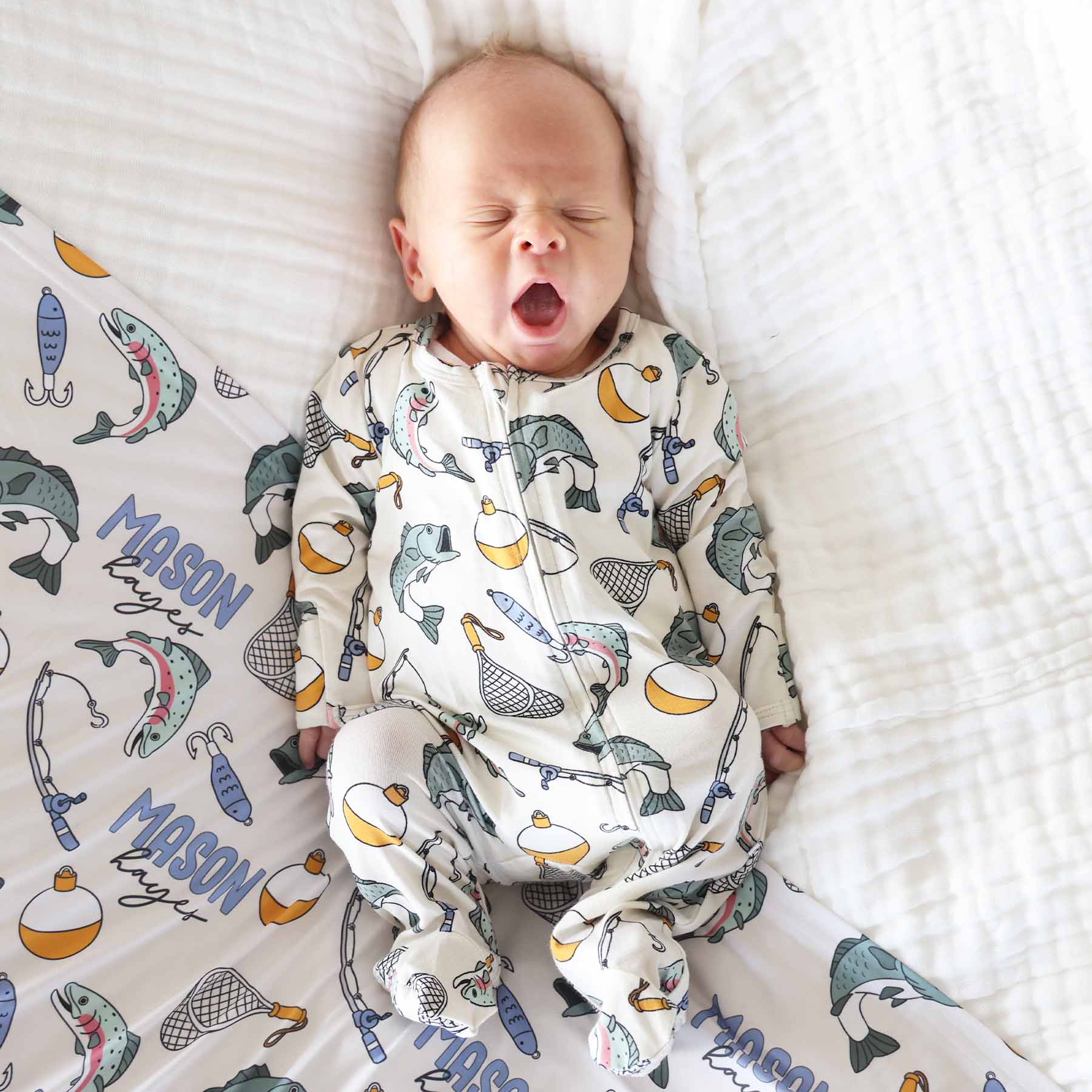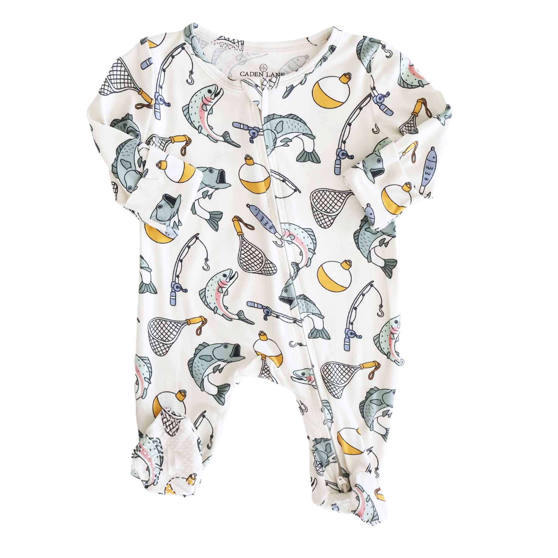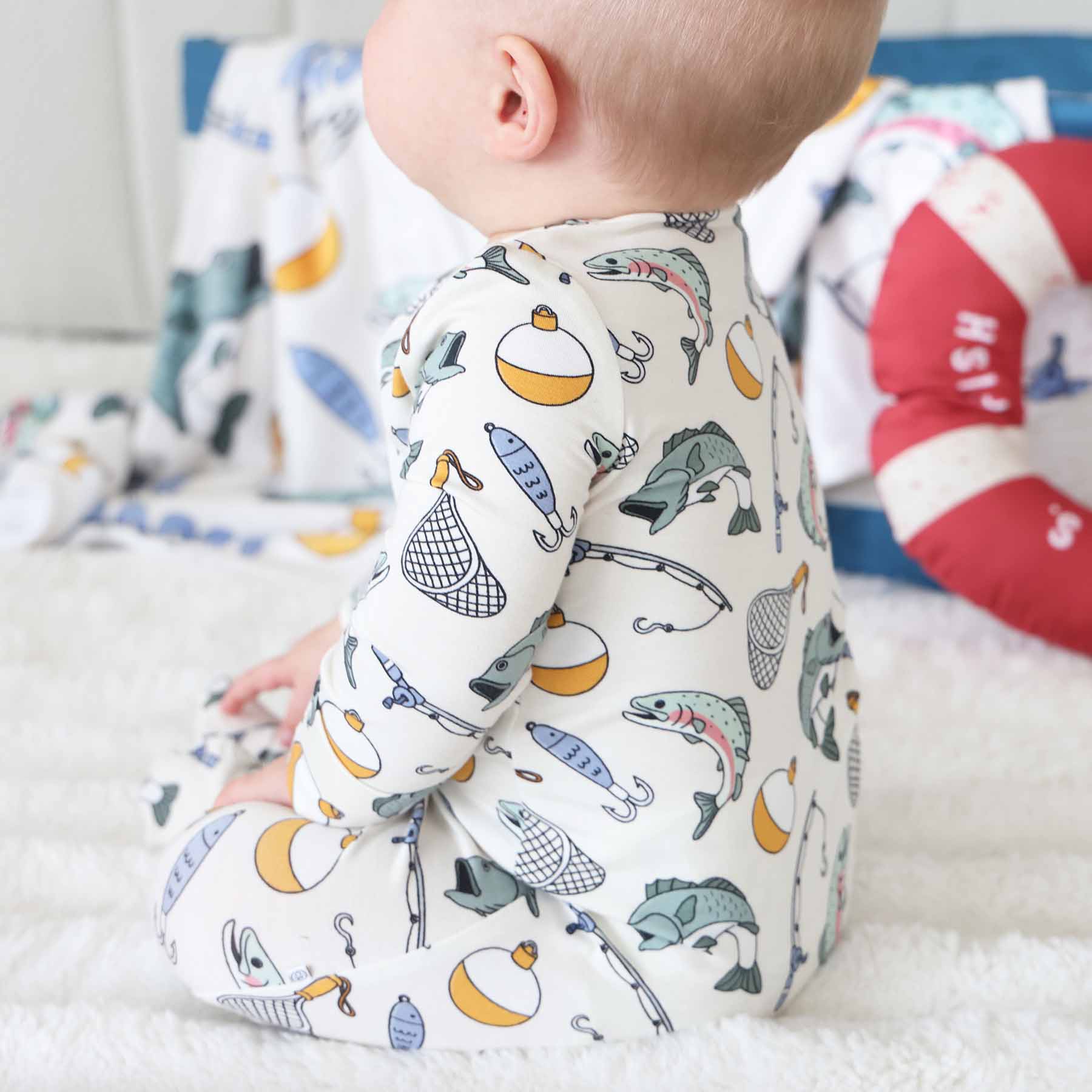 Hook the cutest look for your baby with our Catch of the Day Zipper Footie! Made from buttery-soft and breathable bamboo viscose, this one-piece pajama is perfect for sleepy snuggles, playtime at the cabin, or lakeside lounging. Featuring our Catch of the Day print with playful bass, bobbers, and all the charming details of a day on the water, this fishing-themed footie is a must-have for your little angler. Designed with convenience and comfort in mind, our zipper footie features a two-way zipper for quick and easy diaper changes. Built-in footies keep little toes warm and cozy, while fold-over mittens help prevent accidental scratches. The naturally stretchy bamboo fabric is breathable, moisture-wicking, and gentle on delicate baby skin, making it ideal for day or night, year-round.