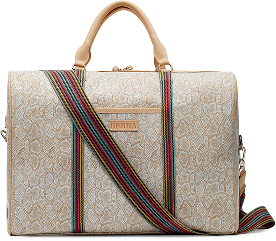 Our Clay Jetsetter in embossed snake print makes a statement with functionality, durability, and style. This spacious duffel is the perfect carry-on for a weekend getaway. Topped with natural leather handles and a comfortable, woven shoulder strap, the Jetsetter is crafted to hold its shape and makes traveling easy with ample interior storage and functional pockets.