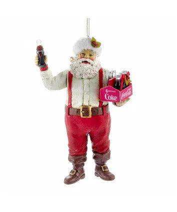 Kurt Adler's Coca-Cola® Santa ornaments are a wonderful addition to your home or holiday décor. This assortment features Santa holding a Coke bottle in one hand and a Coca-Cola® 6 pack in the other.