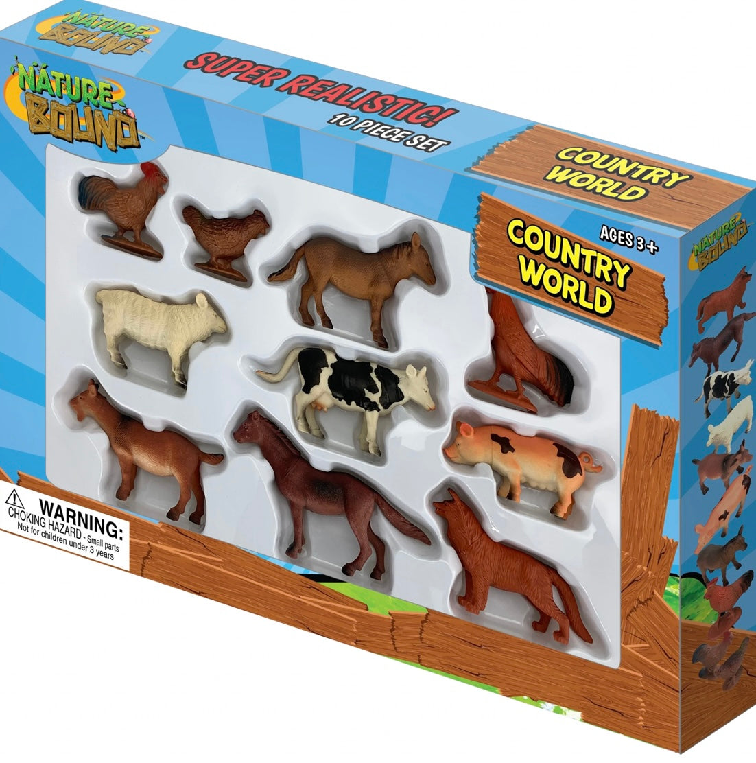 This deluxe set of 10 farm animals are super realistic. Made of high quality PVC plastic - they are rugged and weather proof. These realistic animals make a great gift! Kids will have hours of fun while they learn about nature. Great for teaching, counting, sorting, or just plain fun. This colorful and durable set includes: Goat, Mule, Cow, Horse, Sheep, Dog, Rooster, Chicken, Chick, and Pig. Arrives in a color box so it is great for gift giving. Safety tested for ages 2+ adn the perfect toy for boys and girls.