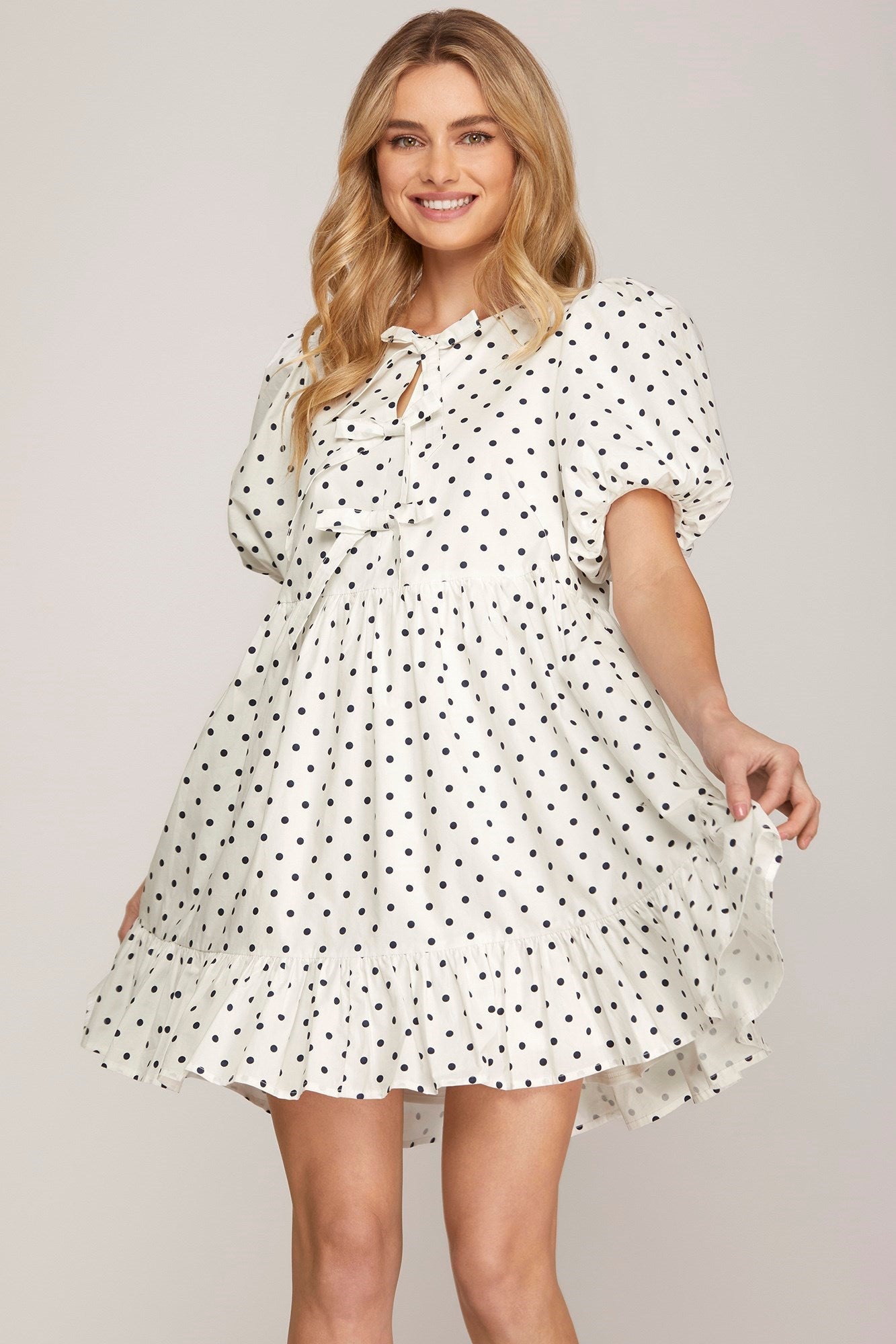 PUFF SLEEVE POLKA DOT WOVEN RUFFLE HEM DRESS WITH FRONT BOW TIE