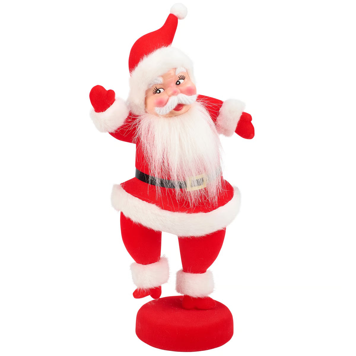 Santa design with red flocking finish and white faux fur trim detail. Our Jolly Santa sitter is designed to free-stand on a flat surface for easy display. A fun retro Christmas home accent that can be easily displayed in any home or work space.