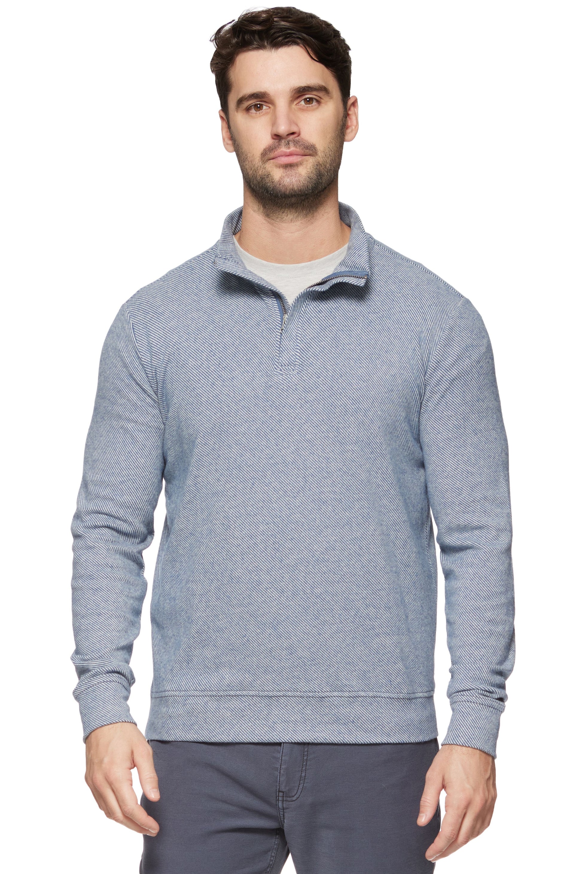 Crafted from a warm, mid-weight cotton blend fabric with a hint of stretch for easy movement and a naturally soft and breathable feel, this timeless pullover features an elevated heathered twill pattern for the perfect blend of rugged and refined. Standing mock neck collar; 1/4-length front zipper from chest to chin. Tailored athletic fit.