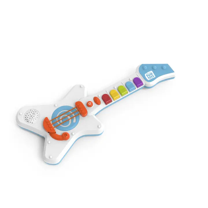This rocking guitar comes ready to play with 3 x AA batteries included. Easy to play lights and sounds kids absolutely love it. Designed for children ages 18+ months. Kids can jam out with this fun guitar.