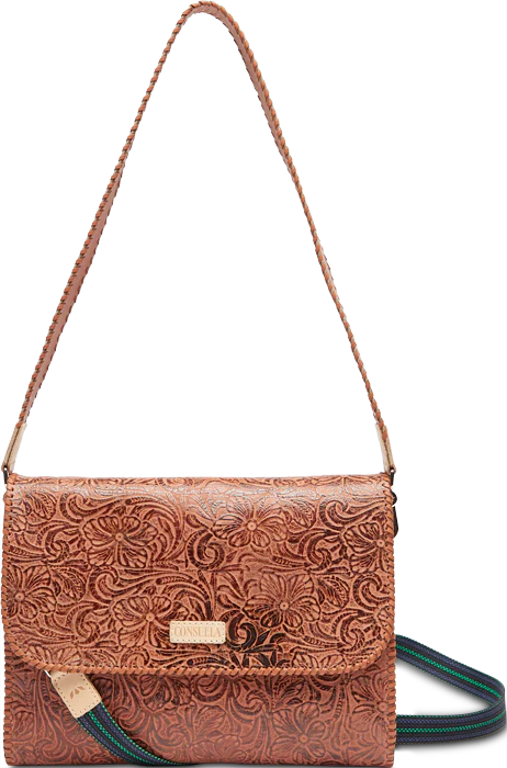 The around Town features whipstitched leather trim and an open interior. This crossbody comes with an adjustable webbing crossbody strap and can easily be converted into a clutch! Keep things organized with the interior zipper pocket and credit card pocket.