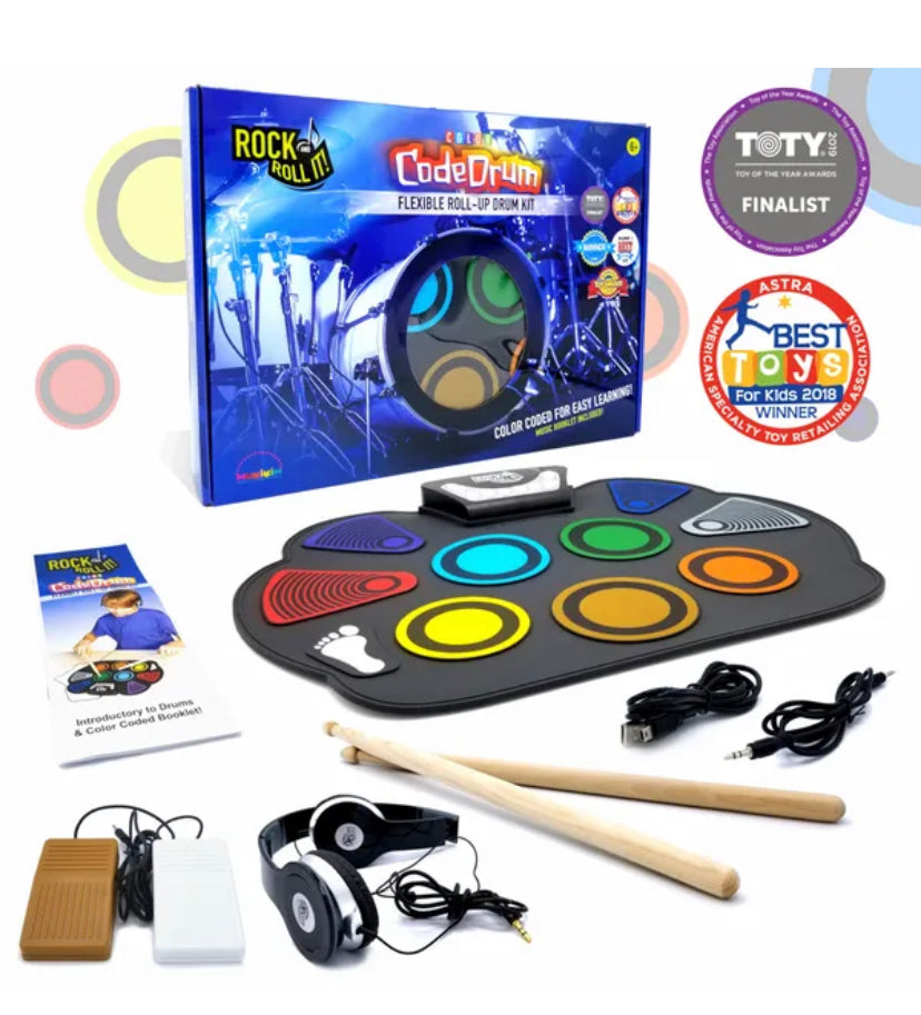 - LEARN TO PLAY THE DRUMS: Perfect for beginners- rock out then roll it up! Color coded set using a spectrum of color makes it easy to learn with included Music Book.