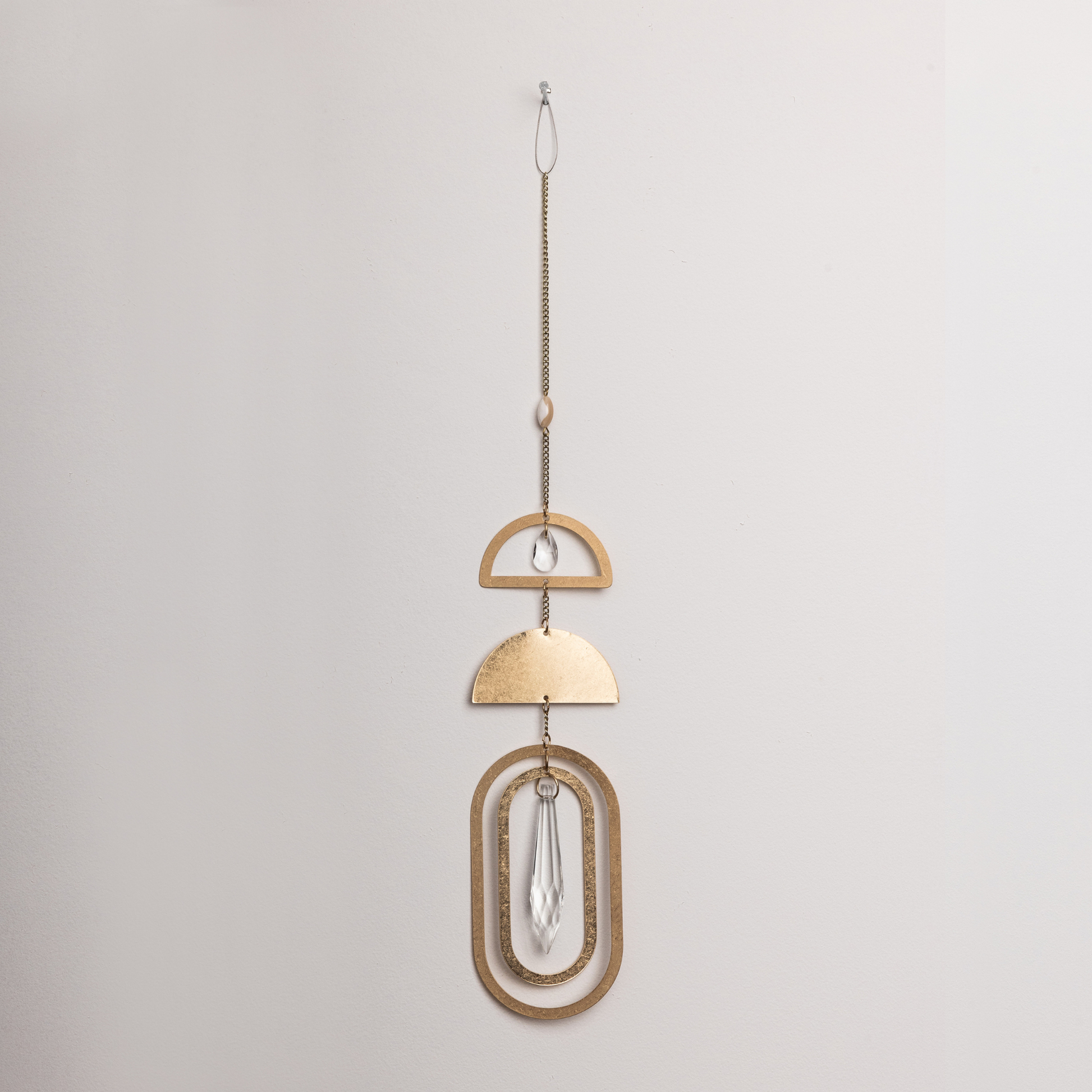Suncatcher is made out of brass with gold plating, crystal, semi-precious stone and suction cup with a metal hook.