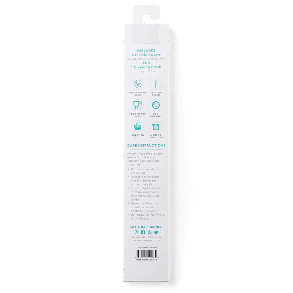 Now you can eliminate the need for those single-use straws and sip from our reusable straws! This straw set includes 6 BPA-free plastic straws, 4 printed and 2 solid color, and 1 straw cleaning brush. They are a perfect fit for our Swig tumblers or any cup of comparable size you may already own. Recommended for cold and room temperature beverages only. Handwashing with the cleaning brush included is recommended for maximum sanitation.